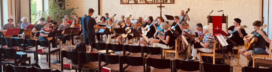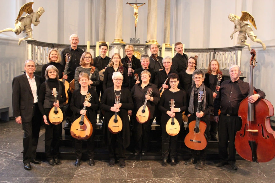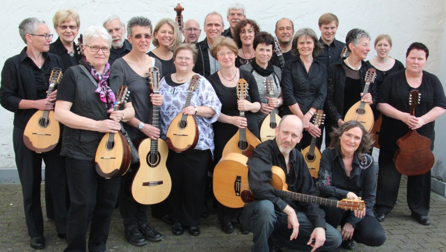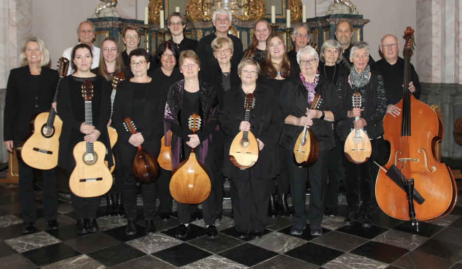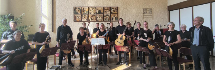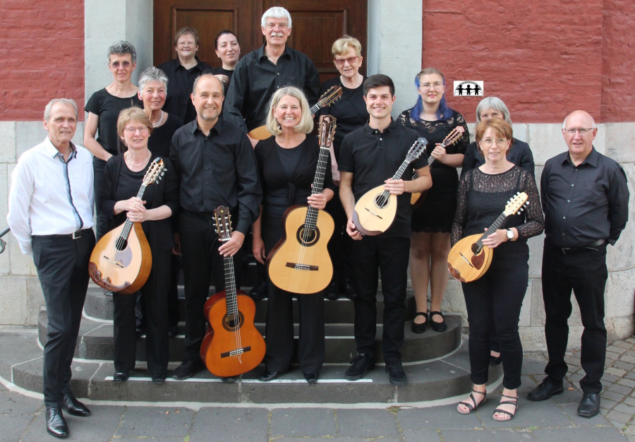 Der Gitarrenchor Bous e.V. und das Grenzland-Zupforchester vor dem gemeinsamen Konzert in der evangelischen Kirche, Schwalbach